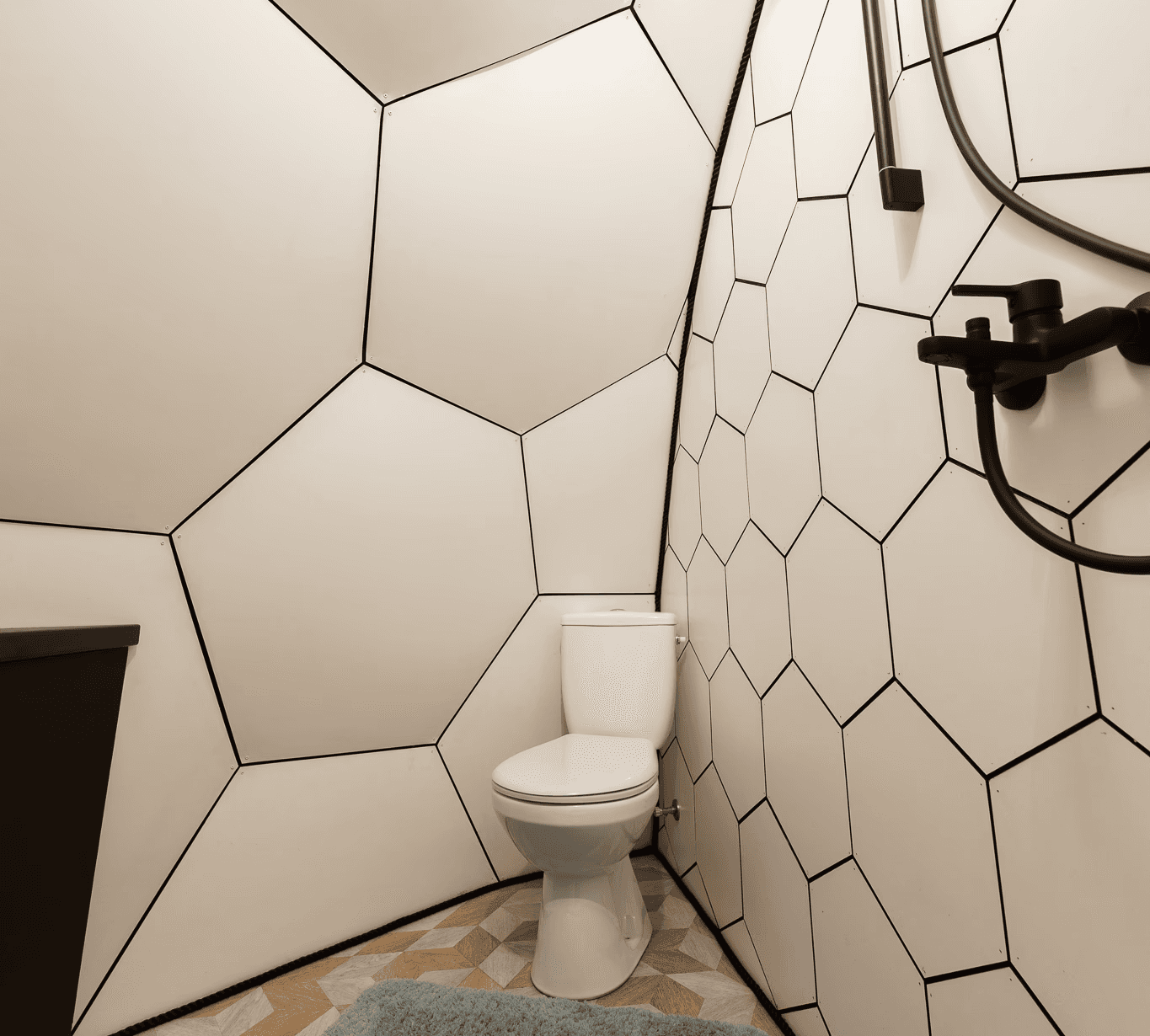 The dome house is designed to maximize space usage while providing all the necessary amenities, but also considering volume conservation. The sauna house includes all the essential elements: a separate steam room, a spacious entrance hall, and a functional restroom. Each room is built to ensure functionality and comfort.